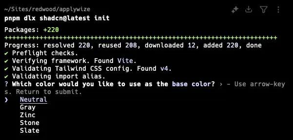 Terminal window npx shadcn@latest initTerminal window pnpx shadcn@latest initTerminal window yarn dlx shadcn@latest initIt will ask you what theme you want to use.