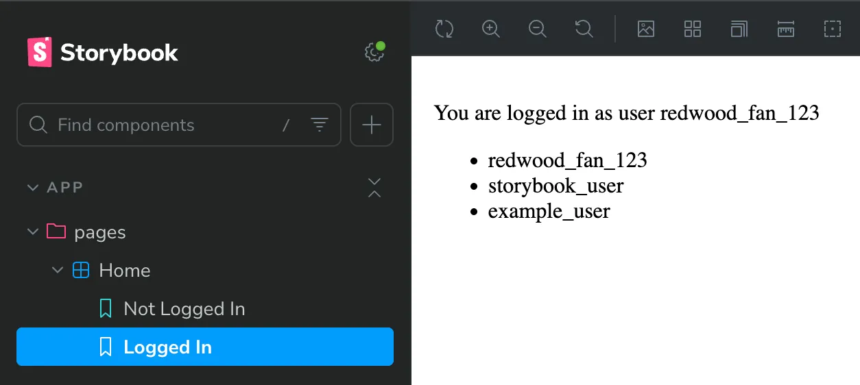 Let’s do it:src/app/pages/Home.stories.tsx 20 collapsed linesimport type { Meta, StoryObj } from "@storybook/react";import { Home } from "./Home";const meta: Meta<typeof Home> = {component: Home,};export default meta;type Story = StoryObj<typeof Home>;export const NotLoggedIn: Story = {args: {ctx: {user: null,session: null,},},};export const LoggedIn: Story = {args: {ctx: {user: {id: "1",username: "redwood_fan_123",createdAt: new Date(),},session: null,},},argTypes: {ctx: {options: ["redwood_fan_123", "storybook_user", "example_user"],mapping: {redwood_fan_123: {user: { id: "1", username: "redwood_fan_123", createdAt: new Date() },session: null,},storybook_user: {user: { id: "2", username: "storybook_user", createdAt: new Date() },session: null,},example_user: {user: { id: "3", username: "example_user", createdAt: new Date() },session: null,},},},},}; -